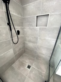 Bathrooms & Laundry: Showers, toilets, vanities, mirrors, tubs & tiles detailed.